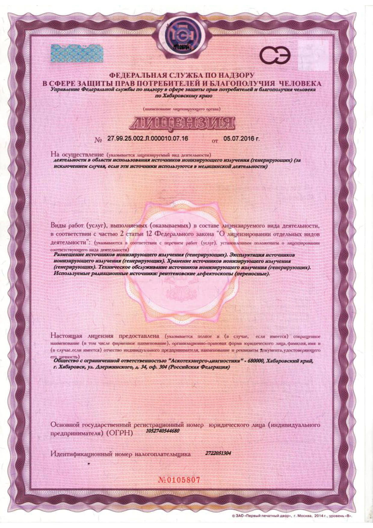 № 27.99.25.002.Л.000010.07.16 от 05.07.2016