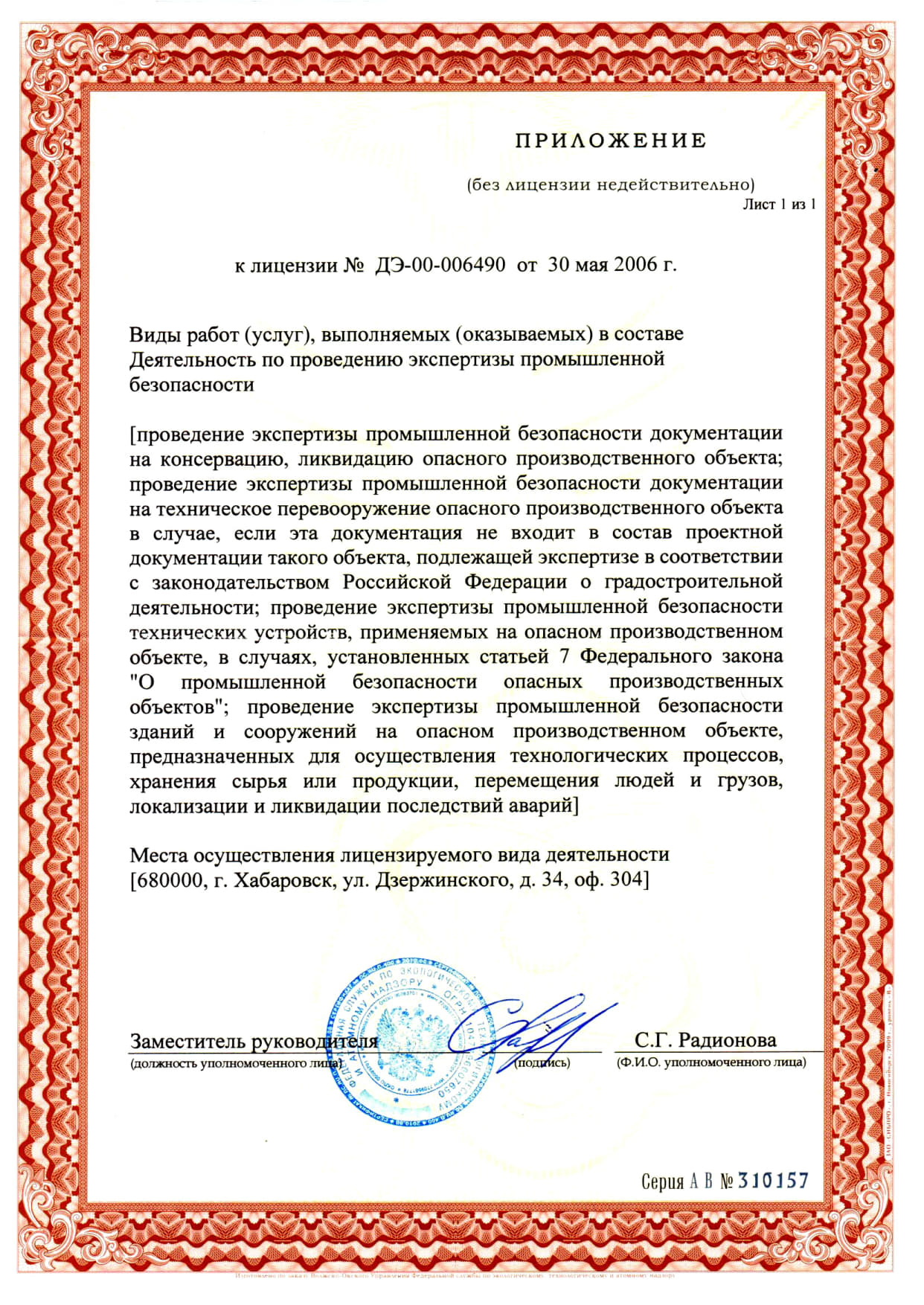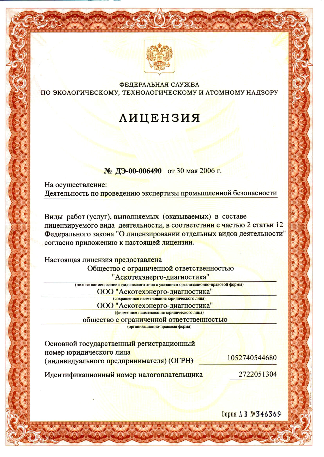 Лицензия на осуществление деятельности по проведению экспертизы промышленной безопасности.