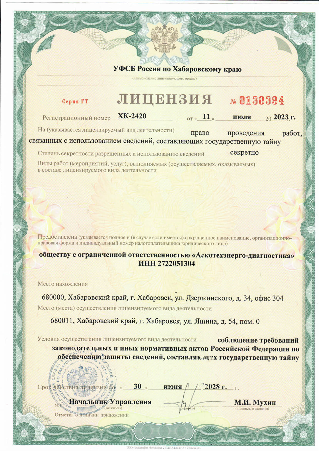 Лицензия на право проведения работ, связанных с использованием сведений, составляющих государственную тайну. Степень секретности разрешенных к использованию сведений - секретно.
